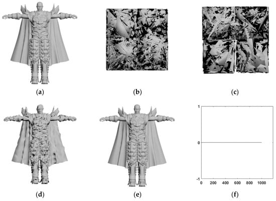 In order to show the feasibility of the proposed watermarking method, the 3D model devil with 30,000 vertices was tested, and other models had similar results. The watermark was a 1024-bit pseudo-random sequence. Firstly, the original model was divided into patches and the encrypted model was obtained by encrypting the 3D model with the public key as illustrated in Figure 12. Secondly, with the embedding key, the watermark was embedded to obtain the watermarked model as illustrated in Figure 12c. Then, the directly decrypted model (as shown in Figure 12d) is obtained by decrypting the encrypted model; of the decrypted model was 30.93. Lastly, the watermark was extracted and the model was restored (as shown in Figure 12e), and the of the restored model approaches infinity, which shows that the restored model was exactly the same as the original model. Figure 12f shows that all watermark bits were correctly extracted. The experimental results showed that the proposed method achieved reversibility of embedding and extraction, and the restoration of the original model. Figure 13 shows five decrypted 3D models had less distortion compared to the original 3D model, and Figure 13f shows the SNR of the decrypted models were close to 30, which denotes the proposed method can obtain good quality.