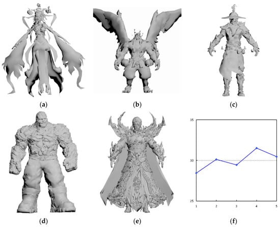 Five watermarked 3D models. (a) The watermarked “Fairy”; (b) the watermarked “Boss”; (c) the watermarked “Solider”; (d) the watermarked “Thing”; (e) the watermarked “Lord”; (f) of the five watermarked models.