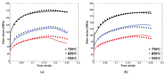In Equation (16) n and K are the total number of samples and independent variables, respectively. Moreover, the residuals are plotted to discuss about the deviation of prediction data from the actual data in terms of the graphical representation to show the characteristic of prediction errors. As shown in Figure 8a, the residuals appear to be random, but Figure 8b–d, noticed to have a wave patterns, which conveys that the model is missing the interaction terms, however, the prediction error range is identified to be less. Besides, from the numerical verification’s, the range of metrics, SSD, SER and coefficient of residual variation (CRV), are computed as 9.9 × 10 to 104.697, 4.97 × 10 to 5.692 and 0.638% to 1.57%, respectively. These numbers prove that the fitted equations showed a better predictability and Equation (15) can be used further for the material constants computation at unknown plastic strain samples. Using Equation (15), to graphically verify the proposed constitutive equations, the stress-strain curves were developed and compared with experimental observations as depicted in Figure 9a–d. In experimental conditions, 850 C and 950 C for low strain rates, considerable deviations are found among the predicted and the test data as shown in Figure 9a,b. The model constants estimation from the high non-linearity stress data at test temperatures, 850 C and 950 C (low strain rates), due to the plastic instability phenomenon, may caused this moderate variation into flow stress modeling.
