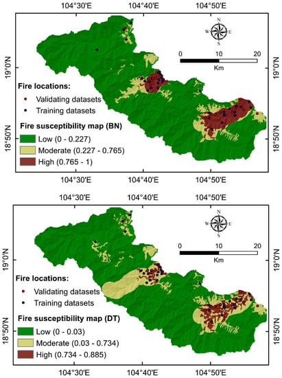 To validate the models and compare them to each other in terms of training and validation performances, we computed several performance metrics processing both training and validation datasets (Table 3). Regarding the PPV metric that is the proportion of correctly classified fire samples out of all samples classified as fire samples, the BN model with PPVtraining = 89.74% and PPVvalidation = 100% performed the best. In terms of the NPV metric that is the proportion of samples that were correctly classified as non-fire, the DT and MLR models with the values equal to 100% were identified as the best models. Regarding the SST metric that measured the models’ abilities to predict a proportion of all fire samples as fire (i.e., true positives), the DT and MLR models with the values equal to 100% were dominant over the other models. In terms of the SPF metric that measured the models’ abilities to predict a proportion of all non-fire samples as non-fire (i.e., true negatives), the BN model with PPVtraining = 89.47% and PPVvalidation = 100% was the best model. In terms of the ACC metric that measured the overall models’ efficiencies, the MLR (ACC = 92.31%) and BN (ACC = 94.12%) were the most efficient models in the training phase and validation phase, respectively. Regarding the Kappa index, the MLR (Kappa = 0.846) and BN (Kappa = 0.884) showed perfect agreement between observed fires and predicted fires in the training phase and validation phase, respectively. These variant training and validation performances that have been also previously observed in different models used for different applications [24,67,68,69,71,77,78,83,92] can be attributed to the specific nature and structure the models applied to different datasets. These results underscore the conclusion drawn by Bui, Khosravi, Tiefenbacher, Nguyen and Kazakis [84] that no model exists that always performs the best for all datasets from different sources.