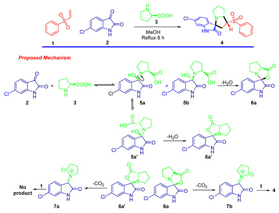 First, the generation of the stabilized azomethine ylide 6a by a set of chemical reactions including condensation was followed by thermal decarboxylation reactions of the 5-chloroisatin with the L-proline. Subsequently, the generated azomethine ylide reacted with the dipolarophile 1 via the 1,3-dipolar cycloaddition reaction affording the desired cycloadduct in a completely regio- and stereoselective manner. The highly cycloadduct formation may be directed by the presence of stabilizing secondary orbital interactions between the 2-oxindoline and the sulphone function of the dipolarophile. This method/multicomponent reaction can be extendable for other starting materials/products.