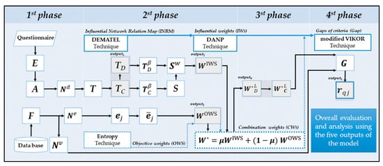 The proposed DANP-mV model is a hybrid research tool that contains the followed methods—DANP, entropy and modified VIKOR. DANP is used to evaluate the network relationship between the criteria and the influential weights of the criteria. The entropy method is mainly used for confirmation of the objective weights and the modified VIKOR method is applied for alternative selection. The complete operating process illustrated in Figure 1 can be divided into four phases: