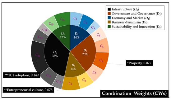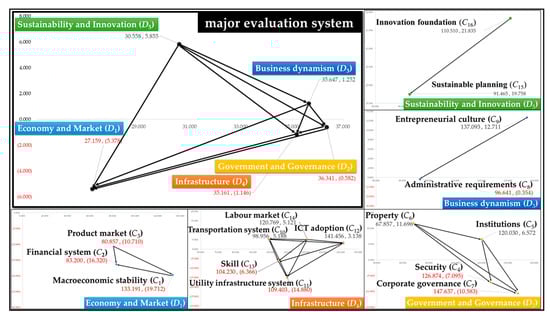 Table 3 and Table 4 show the input data of analysis used by the proposed DANP-mV model. Following the steps outlined in Section 3, five outputs are obtained—(1) the INRM; (2) influential weights (IWs); (3) objective weights (OWs); (4) combination weights (CWs); (5) comparison and ranking of alternatives. DEMATEL can be used to derive the INRM (Figure 2) which provides a visual basis to help decision makers formulate sustainable development strategies for improvement. An examination of Figure 2 shows that Sustainability and Innovation (D5) and Business dynamism (D3) are causal factors in the whole system, whereas Government and Governance (D2), Infrastructure (D4) and Economy and Market (D1) are affected factors. In addition, this study finds that Government and Governance (D2) has the greatest influence on the entire evaluation system, which is similar to the results of Janssen and Van Der Voort []. This also shows that the quality of local governance plays an important role. A stable, more credible and effective and less corrupt system will affect the choice of this location for foreign investors.
