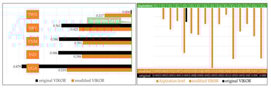 The concept of VIKOR originated from the problem of multi-objective planning []. Opricovic [] applied it to the research of civil engineering. Opricovic and Tzeng [] made a comparison between VIKOR and TOPSIS and their results showed that performance evaluation using VIKOR would be more reasonable and effective. For the detailed operation processes of original VIKOR, please refer to References [,,]. In this study, modified VIKOR will be used as the following steps:
