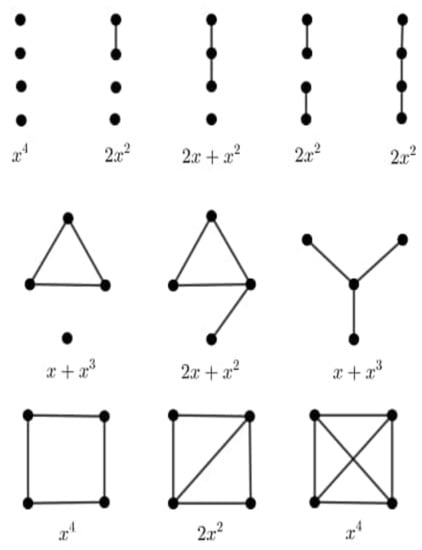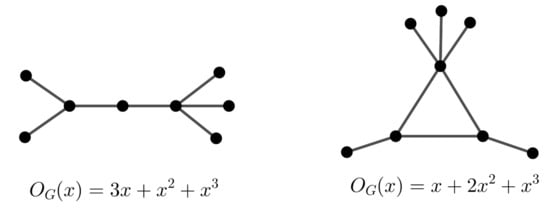 Following the methods of [], in this section we introduce several classes of graphs that can be characterized by their orbit polynomials. If G is a graph with , then clearly  and, in general, if G has n vertices and , then G is has no non-identity automorphism. This means that G is asymmetric. For a graph with two vertices, it is clear that  or  and thus . Suppose G is a graph with three vertices. Then  or  or . There is no graph of order 3 with , since the smallest graph in the identity automorphism group has at least six vertices, as can be seen in []. Graphs with  are  and its complement and graphs with the orbit polynomial  are  and .