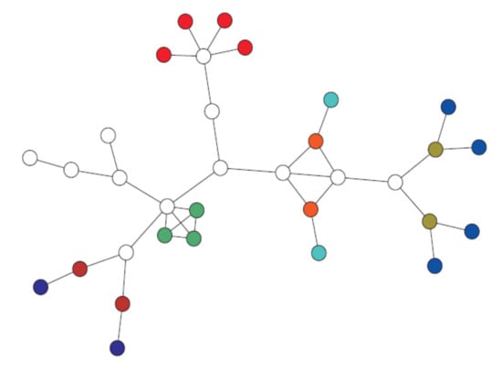 Consider the graph  as depicted in Figure 6. It presents a typical arrangement of symmetric subgraphs found in many real-world networks. The structure of the network automorphism group is completely related to the automorphism group of subgraphs induced by its orbits. In [], the authors determined the structure of the automorphism group of , which is: