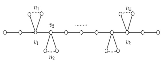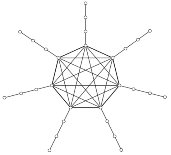 Finally,  (’s are greater than or equal to zero and at least one of them is not zero) pendent vertices are attached to the ith vertex of . The resulting graph was denoted by , as can be seen in Figure 10. It is not difficult to see that , where .