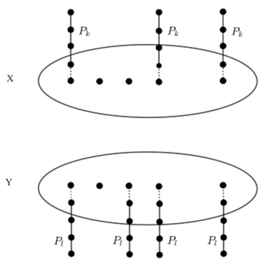 Let G be a graph with two orbits X and Y. Attach to each vertex of X the path graph  and to each vertex of Y, the path , as can be seen in Figure 9. Then, the resulting graph  has the orbit polynomial .