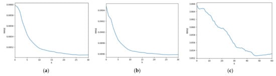 RMSE of tested models (RMSE = y-axis, data measurements—‘k’ = x-axis): (a) Indoor_PM2.5, (b) Indoor_PM10, (c) Indoor_NO2.