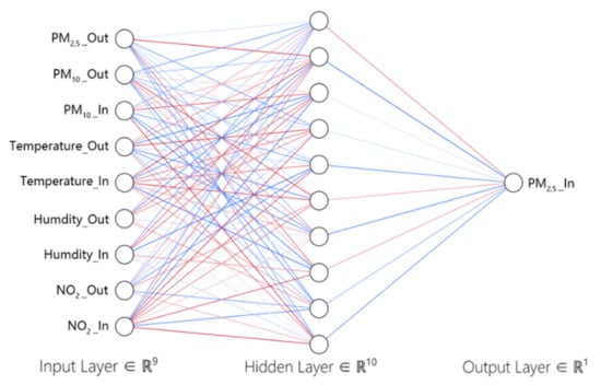 Artificial neural networks have been widely employed to investigate complex ambient-air processes. Many studies have predicted the concentrations of indoor air pollutants with ANN [,,]. Multi-layer perceptron (MLP) network is one of the major types of ANN architectures []. Usually, the MLP network is consists of input, output, and multi-layers (including a hidden layer) []. Each layer is composed of several interconnected non-linear processing components called neurons or nodes [,]. The selected neurons were connected to other neurons in adjacent layers through adaptive synaptic coefficients [,]. In this study, two-layer feed-forward neural network models were developed using the neural network toolbox of MATLAB R2020a []. The same dataset used in the MLR and TSR approach, 18,144 time-series data for each input neuron used to train the ANN models. The logistic sigmoid transfer function and linear activation function were used to avoid the fitting problem between input and output datasets. The input dataset was normalized using min–max normalization. The ANN models were trained with the Levenberg–Marquardt (LM) based back-propagation (BP) algorithm [,,]. The LM algorithm is one of the most effective algorithms which accelerates the convergence rate of the ANN with multilayer perceptron (MLP) architectures and reserves computational resources [,]. Studies have found the optimal number of hidden neurons to obtain the best network performance. In this study, the number of hidden layers was computed to be 10 from several iterations [,,,,]. As shown in Figure 3, the input layer contains nine neurons of indoor and outdoor air quality parameters. The measured indoor concentrations of PM2.5, PM10, and NO2 were considered as the desired target of the ANN models. For each training, the database was randomized into three groups: 70% training, 15% validation, and 15% testing [,]. The optimum network architecture of the ANN models was developed with 10 hidden layers [,]. The performance of developed ANN models was examined by calculating the coefficient of determination (R2) and root means square error (RMSE) [,].
