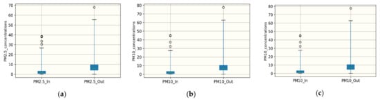 Four-month evaluation of indoor and outdoor air quality measured at 10 min intervals (2016 observational points for two weeks equating to 18144): (a) PM2.5, (b) PM10, (c) NO2.