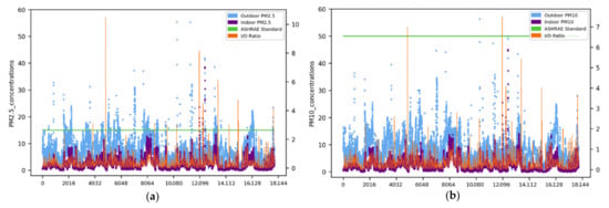 The descriptive statistics of measured indoor and outdoor environmental data are presented in Table 2 and Figure 4. The mean indoor and outdoor temperatures were 70.7 °F and 81.5 °F, respectively, while outdoor relative humidity had a slightly higher mean and a larger standard deviation than indoors. The average mean of indoor PM2.5, PM10, and NO2 was significantly lower indoors than outdoors. It shows that the indoor concentration of PM2.5 range was 0 μg/m3 to 38.5 μg/m3, indoor PM10 was 0 μg/m3 to 68 μg/m3, and NO2 was 72.3 ppb to 83.9 ppb. Figure 5 shows the plots of the four-month-long continuous records based on 10 min intervals. Most indoor PM2.5 and PM10 data met the 24 h safe levels in ASHRAE 62.1-2019 standard []. The indoor concentrations of both particulate matters followed a similar diurnal pattern as the outdoor concentrations. It can be seen from Figure 4c. The indoor NO2 data show a significantly stable pattern than the outdoors across the sampling period. The potential reasons for this trend might be due to most gaseous pollutants have infiltrated and a lack of indoor NO2 sources [,,]. However, the majority of indoor NO2 data lie above the annual requirements of ASHRAE 62.1 standard (53 ppb) [,].