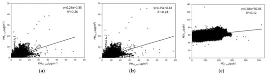 Comparison between indoor and outdoor data in using linear regression: (a) PM2.5, (b) PM10, (c) NO2.