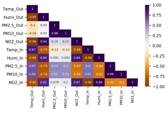 Simple linear regression and the nonlinear Spearman’s rank correlation were performed to extract the direct correlation between indoor data and their corresponding outdoor data. The dataset was also used to investigate the symmetry among indoor and outdoor time-series concentrations. The input dataset was normalized using standardized normalization. Figure 6a,b show the linear correlation and symmetric distributions between indoor and outdoor particulate matters (PM2.5 and PM10) with very coefficient of determination (R2_PM2.5 = 0.26; R2_PM10 = 0.24, p < 0.01). However, statistically moderate correlation (R_PM2.5 = 0.53; R_PM10 = 0.52) were found in the Spearman’s rank results. From Figure 7, Spearman’s coefficient shows a significant correlation coefficient (R_NO2 = 0.87) between indoor and outdoor NO2. Conversely, a very low correlation was found between indoor and outdoor NO2 in the linear regression analysis (Figure 6c). There were statistically significant mismatches between the non-linear Spearman’s coefficients and the linear correlation coefficients. The results also indicated that the univariate linear regression method might not accurately predict the indoor concentrations of PM2.5, PM10, and NO2. Since these results are not compelling, multivariate analysis and further validation should be considered for the IAQ prediction model.