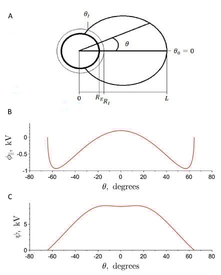 “Coordinate system after change of variables from l to magnetic latitude (A). Distribution of parallel (B) and transverse (C) Alfvén wave electric potentials along the magnetic field line. See the text for numerical parameters” [].