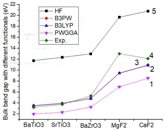 BaTiO3, SrTiO3, BaZrO3, MgF2 as well as CaF2 (Γ-Γ) bulk bandgaps (in eV) ab initio computed by means of various methods [,,,,]. Available experimental data for bulk (Γ-Γ) bandgaps (in eV) are listed for comparison purpose [,,,,].