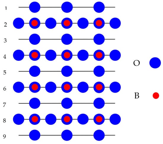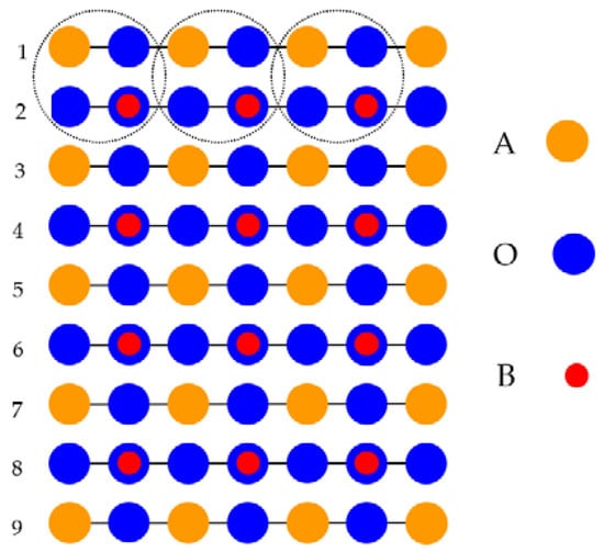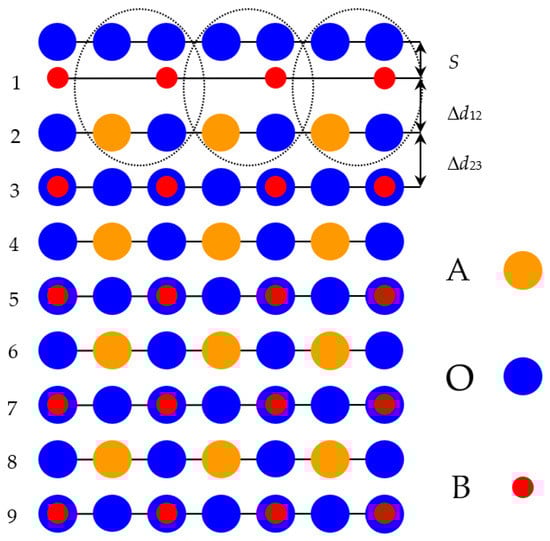 For our ab initio computations of AO-terminated BaTiO3, SrTiO3 and BaZrO3 (001) neutral surfaces, we used, from both sides, AO-terminated mirror-symmetrical slabs containing nine alternating AO and BO2 layers (Figure 4). These AO-terminated ABO3 perovskite (001) nine-layer slabs consisted of a supercell containing 22 atoms (Figure 4). They were non-stoichiometric, and they had the following unit cell equation A5B4O13 (Figure 4). The only striking difference between the AO-terminated BaTiO3, SrTiO3 and BaZrO3 (001) slabs (Figure 4) and O-terminated ReO3 and WO3 slabs was the missing O atom in the ReO3 and WO3 (001) slabs (Figure 5). Thereby, the O-terminated ReO3 and WO3 nine-layer (001) slabs consisted of alternating O-BO2-O-BO2-O-BO2-O-BO2-O layers (Figure 5). They contained 17 atoms and had the following unit cell equation B4O13 (Figure 5).