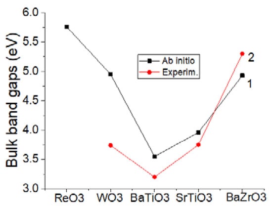 As a next step, by means of B3LYP or B3PW (Table 4 and Figure 6) hybrid exchange-correlation functionals, at the ab initio level, we computed the ReO3, WO3, BaTiO3, SrTiO3 and BaZrO3 bulk Γ-Γ bandgaps. As we can see from Table 4 and Figure 6, our B3LYP computed ReO3 bulk Γ-Γ bandgap is equal to 5.76 eV. This is a theoretical prediction since, to the best of our knowledge, there is no experimental bandgap yet detected for the ReO3 matrix at Γ-point. Our computed WO3 bulk Γ-Γ bandgap (4.95 eV) by 1.21 eV exceeds the WO3 experimentally detected [] bulk Γ-Γ bandgap (Table 4). Determined by means of the B3PW hybrid exchange-correlation functional ab initio, our computed BaTiO3 (3.55 eV), SrTiO3 (3.96 eV) and BaZrO3 (4.93 eV) bulk Γ-Γ bandgaps are in a fair agreement with the experimentally measured bulk Γ-Γ bandgaps for BaTiO3, SrTiO3 and BaZrO3 perovskites (3.2 eV, 3.75 eV and 5.3 eV, respectively) (Table 4 and Figure 6).