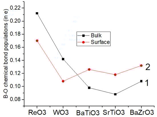 Our ab initio computed Re-O, W-O and B-O chemical bond populations (in e) for the ReO3, WO3, BaTiO3, SrTiO3 and BaZrO3 crystal bulk as well as their ReO2-, WO2- and BO2-terminated ReO3, WO3, BaTiO3, SrTiO3 and BaZrO3 (001) surfaces.