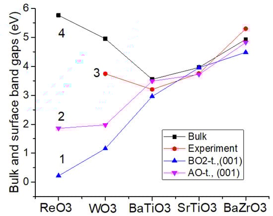 Our ab initio computed ReO3, WO3, BaTiO3, SrTiO3 and BaZrO3 bulk Γ-Γ bandgaps (in eV) (line 4), experimental bulk Γ-Γ bandgaps (line 3), AO-terminated (001) surface bandgaps at Γ-point (line 2) as well as BO2-terminated (001) surface bandgaps at Γ-point (line 1).
