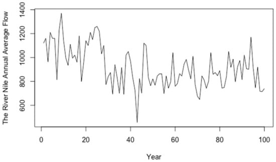 The Nile dataset is the internal dataset in R, which represents the measurements of the annual average flow (in unit ) of the River Nile at Aswan between 1871 and 1970. In this section, we mainly focus on the annual average flow data of the Nile from 1871 to 1970. Based on the scatter diagram in Figure 1, we can roughly learn that the annual average flow of the River Nile showed a downward trend before 1914, then increased rapidly after 1914. In addition, it should be noted that the number 1 in the abscissa of the graph represents 1871, and so on.