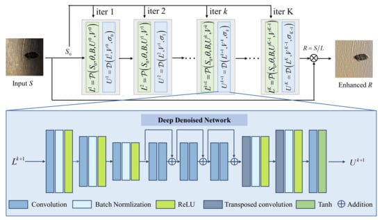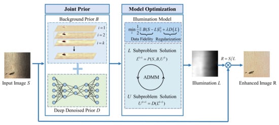 where the first term is the data fidelity term determined, the second term is the regularization prior term, and is the regularization parameter. B denotes the background prior. H means the deep regularization prior. For simplification, the proposed retinex model can be rewritten as