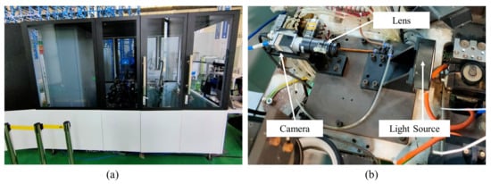 Motor commutator defect detection equipment. (a) Motor commutator production line. (b) Motor commutator vision system.