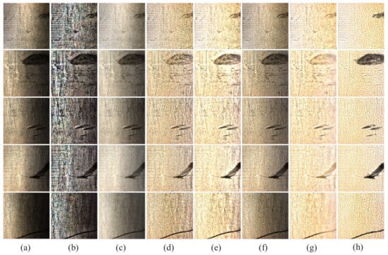 Comparisons of enhanced results by different methods on the MCSD Dataset. (a) Input images. (b–h) Enhanced results by CLAHE [], GC [], JieP [], GTV [], LD [], STAR [], and our method, respectively.