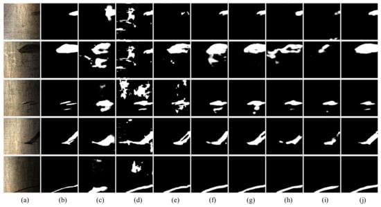 Comparisons of defect detection results on the MCSD Dataset. (a) Input images. (b) Label. (c) Baseline. (d–j) Defect detection results of the enhanced images after applying CLAHE [], GC [], JieP [], GTV [], LD [], STAR [], and our method, respectively.