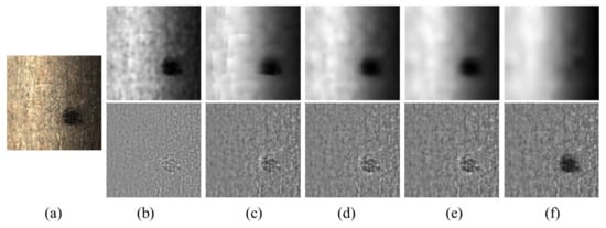 Recently, convolutional neural networks (CNNs) have been widely applied in image processing, including illumination correction [,]. Such models learn the relationship between image pairs with uneven and normal illumination via an end-to-end approach. Popular network structures, such as fully convolutional networks (FCNs) and encoder–decoder networks, have achieved good results when applied for uneven illumination correction. However, it is difficult to obtain uneven/normal illumination image pairs in an industrial context. Furthermore, deep-learning-based methods exhibit a strong dependence on the training dataset, and therefore, the difficulty of data acquisition has greatly restricted their application in complex scenarios.