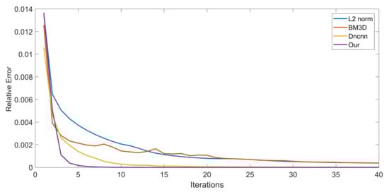 Further, we analyzed the convergence properties of different denoising priors. The iterative curve of the estimated illumination images are shown in Figure 9; it can be seen that the iterative processes of different denoising priors are all monotonically convergent. The deep denoiser prior has the fastest convergence speed, which only needs six iterations to converge and obtain the decomposed results.