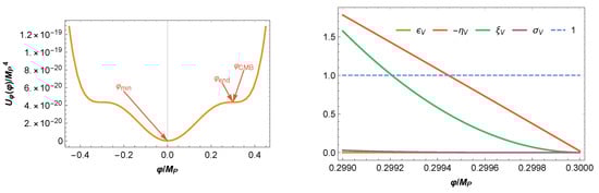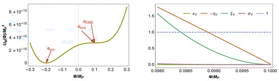 where d can be obtained from Equation (16), and  (where  are dimensionless). The modification  is made such that  is close to  and we get near-inflection scenario, which is enough for cosmological purposes [,]. After this modification, the potential of Equation (2) becomes