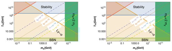 The unshaded triangular region on the () plane indicates the allowed region: Left panel is for Model I, whereas right panel is for Model II. The colored zones are coming from different bounds: (a) the horizontal stripe of light green color:  should be more than  (Big Bang Nucleosynthesis (BBN) temperature) [] (see also [,,]), (b) the horizontal stripe of blue color: from the maximum permissible value of  from the stability analysis of Section 3, (c) the light pink colored region in the top-left corner: from the allowed maximum value of  from the stability analysis of Section 3, (d) the green (medium sea green) colored vertical strip on right from the maximum possible value of  ( must be <), (e) the peach (peach puff) colored region shows bound from Ly- estimation :  or  []. The diagonal discontinuous lines correspond to different values of  and represent the allowed range of  satisfying present-day CDM yield, provided that  is produced solely from the decay channel of inflation during the reheating era.