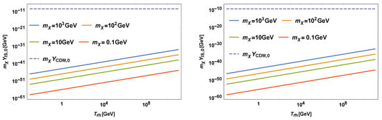 where  is the DM yield, and  with  being the effective number of degrees of freedom of the components contributing to the relativistic fluid of the universe. We assume the  particles remain out of equilibrium with the thermal plasma of the universe. If the CDM is completely contributed by , then the  should be equal to the present-day CDM yield [].