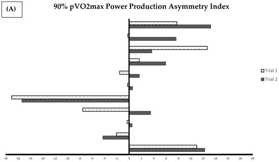 Power production AI results and reliability data are reported in Table 1. Power production AI data were normally distributed. Individual asymmetry index values are illustrated in Figure 1. ICC results were interpreted as having excellent reliability in the power production AI at 60%, 70%, 80%, and 90% of pVO2max. The two-way repeated measures ANOVA revealed no significant intensity–visit interactions for the power production AI (f = 0.835, p = 0.485, η2 = 0.077), with no significant main effects present for intensity (f = 0.270, p = 0.847, η2 = 0.026) or Visit (f = 0.011, p = 0.919, η2 = 0.001).