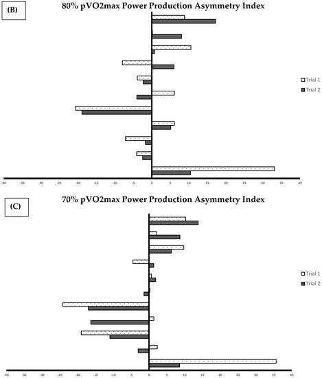 The purpose of the current investigation was to examine the effects of exercise intensity on asymmetry in pedal forces when the accumulation of fatigue is controlled for, and to assess the reliability of asymmetry outcomes during cycling. Participants completed an incremental cycling test to determine maximal oxygen consumption and the power that elicited maximal oxygen consumption (pVO2max). Participants were allotted 30 min of recovery before then cycling at 60%, 70%, 80%, and 90% of pVO2max for 3 min each, with 5 min of active recovery between each intensity. Participants returned to the laboratory on separate days to repeat all measures. A two-way repeated measures analysis of variance (ANOVA) was utilized to detect differences in power production AI at each of the submaximal exercise intensities and between Trials 1 and 2. Intraclass correlations were utilized to assess the test–retest reliability for the power production asymmetry index (AI). An ANOVA revealed no significant intensity–visit interactions for the power production AI (f = 0.835, p = 0.485, η2 = 0.077), with no significant main effects present. ICC indicated excellent reliability in the power production AI at all intensities. Exercise intensity did not appear to affect asymmetry in pedal forces, while excellent reliability was observed in asymmetry outcomes.