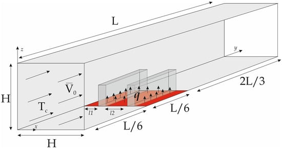 Mixed convection is considered in a rectangular horizontal channel of size L × H × H (L = 3H). The channel features infinitely thin walls and is subjected to an energy source of constant heat flux. Additionally, a symmetrical two-fin system is mounted on the surface of the channel. The analyzed geometry is schematically shown in Figure 1. The working fluid is considered to be Newtonian, thermally conductive, and satisfying the Boussinesq approximation. The energy source is located at a distance of H/2 from the entrance to the channel. The side walls of the channel are considered to be adiabatic. A horizontal cooling flow is supplied at the inlet. All wall surfaces are assumed to be impermeable. The thermophysical characteristics of the liquid are constant, and the flow regime is laminar. The solid fins are assumed to be heat-conducting. It is assumed that the fluid flow and heat transfer inside the channel are three-dimensional and that viscous dissipation is neglected. The fins are placed at the heater surface with an identical distance between the fins and the nearest channel wall. Such a symmetrical location of fins allows for analyzing the influence of the distance between the fins on heat transfer performance, excluding possible asymmetrical interactions between the fin surface and channel walls.