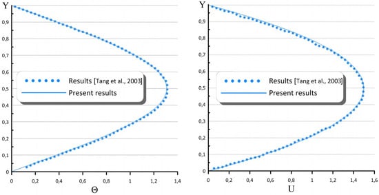 As an approbation of the developed numerical algorithm, the problem of mixed convection in a channel with heated upper and lower walls with temperature Tw has been chosen. Analysis has been performed for the following values of governing parameters: Reynolds number Re = 10, Prandtl number Pr = 0.7, the temperature of the working medium at the entrance of the channel is Tin = 20 °C, and the horizontal component of the velocity vector uin = 0.01 m/s. The following non-dimensional temperatures and velocities have been used:  and . Here, Θ is the dimensionless temperature, U is the dimensionless velocity, Tb is the bulk temperature of the section. Figure 2 shows a comparison between the obtained results and numerical data of Tang et al. [] for vertical temperature and velocity profiles. As shown in Figure 2, a good agreement has been obtained, indicating the operability of the developed computational algorithm.
