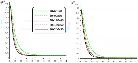 Time dependences for the average heater temperature  and average fin temperature  were obtained for different grids.