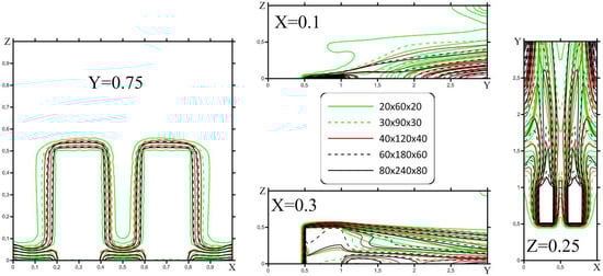 Another important verification problem is the mesh sensitivity analysis for the local and integral parameters. Figure 3 and Figure 4 present integral and local characteristics for the problem presented in Figure 1, in the case of Re = 500, aluminum fins, and the position of the fins: l1/H = 1/5 (l2 = l1). From the data presented in these Figures, it can be concluded that it is possible to use grids of 40 × 120 × 40, 60 × 180 × 60, and 80 × 240 × 80 elements. However, the calculation speed increases up to 2.7 and 6.3 times, respectively, as the dimension increases in these ranges. Therefore, the uniform mesh of 40 × 120 × 40 elements has been chosen as the most optimal grid.