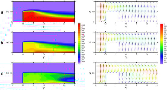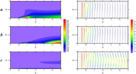 (a) Re = 200, (b) Re = 500, and (c) Re = 1000. The temperature field (left column) and the velocity field (right column) for aluminum fins at different values of the Reynolds number in the cross-section X = l1/2H for the case Loc2.