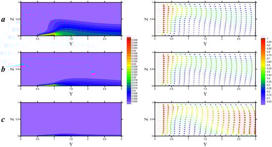 (a) Re = 200, (b) Re = 500, and (c) Re = 1000. The temperature field (left column) and the velocity field (right column) for aluminum fins at different values of the Reynolds number in the cross-section X = 0.5 for the case Loc2.