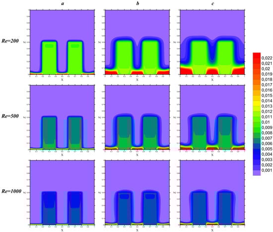 Figure 5 shows that a layer with a thermal plume is formed for a low Reynolds number (Figure 5a), which is practically not carried away by the coolant liquid flow. As a result, a thermal boundary layer is formed above the heater with a slight offset towards the growth of the Y-coordinate. In the case of an increase in the Reynolds number, there is practically no zone of elevated temperature above the energy source. The region of maximum values of the temperature field near the channel outlet at Re = 500 is caused by boundary conditions of the second kind on the walls and an initial non-dimensional temperature Θ = 0.5. As a result, the temperature on the surface of these walls has not changed for the considered time interval. The velocity fields in this figure reflect a characteristic decrease in the y-component of the velocity vector when the liquid interacts with the heat sink. However, at Re = 1000 (Figure 5c), a noticeable increase in the velocity value in the lower half of the channel is closer to its outlet.