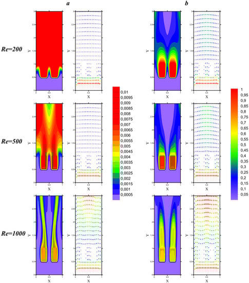 The thermal plume from the solid fins can be seen more clearly in Figure 9 in the cross-section of the cavity for Z = const. At Z = 0.25 and Re = 200, the temperature of the medium near and behind the heater, as well as the source itself, has the same values. As Re increases, the average temperature in the cavity decreases. When Re = 1000, the maximum temperature values are observed in the zone of the back side of the ribs. Figure 9b shows the temperature and velocity fields for Z = 0.5.