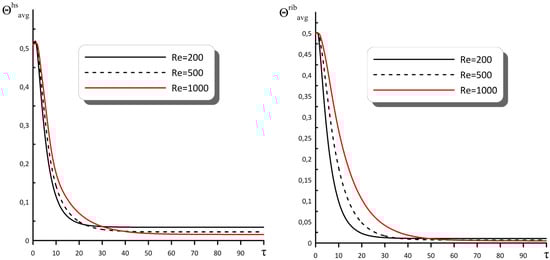 Figure 10 shows time profiles of the average temperature inside the heater and solid fins, depending on Re. It can be seen that with an increase in the Reynolds number, the temperature decreases both inside the fins and heater. Therefore, the minimum average temperature for the steady state is equal to 0.00518 within the fin and 0.01552 within the heater for Re = 1000. When the Re is reduced to 500, it increases the average temperature within the fin by up to 32% and within the heater by up to 41.7%. Furthermore, for Re = 200, one can find the following increments up to 104% and 119%, respectively. In general, low temperatures are observed at the specified parameters due to the choice of water for the cooling liquid, which removes high heat flux. Most often, gases that do not have the same efficiency are used in cooling systems. In such cases, it is necessary to further study the effective parameters for maximum temperature reduction in the heater.