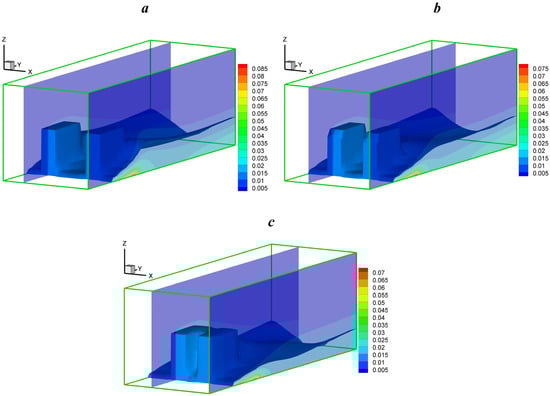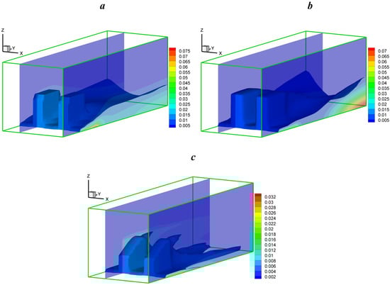 Figure 11 shows the temperature field in three-dimensional form. An isosurface is selected at a temperature of Θ = 0.005, which means a zone separating temperature layers. Namely, the area above the specified isosurface corresponds to a lower temperature, while a zone below corresponds to a large one. It can be seen how the shape of this surface changes with an increase in the Reynolds number. A characteristic level appears on the fins, indicating a decrease in temperature due to the incoming coolant flow to the front boundary. It can also be noted that the area behind the ribs with an increased temperature can be explained by the initial temperature and the less intensive cooling of the side walls.