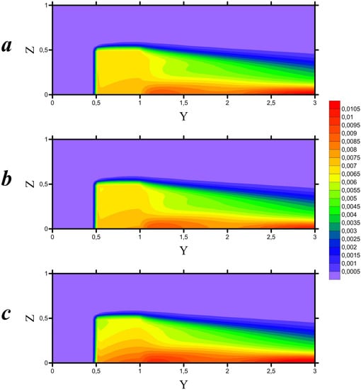 The formulated boundary-value problem has been solved by the finite difference method on a uniform mesh. To solve the parabolic Equations (8)–(10), (12) and (13), a local one-dimensional Samarskii scheme has been used. This allows the transition from a spatial formulation of the problem to a system of one-dimensional equations with appropriate approximations for the convective and diffusive terms. The Thomas algorithm has solved the resulting system of linear algebraic equations (SLAE). The monotonic Samarskii scheme has been used to approximate the convective terms, while central differences are used to discretize diffusive terms. The system of elliptic Equation (11) has been solved using seven-point difference schemes, which allow moving from a differential form to a system of linear algebraic equations. As a result of the approximation of the partial differential equations by the central differences with a second order of accuracy, the obtained SLAE has been solved by the successive over-relaxation method [,,].