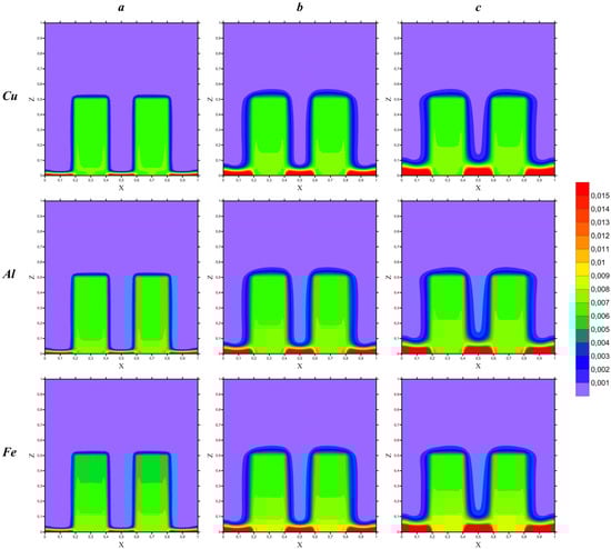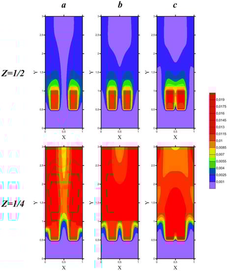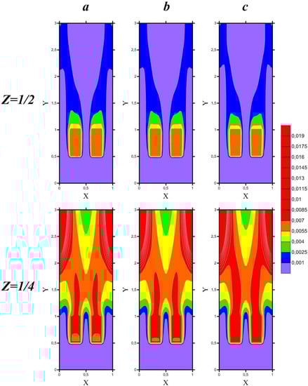 Figure 14 shows the temperature fields at Y = 0.5 (a), Y = 0.75 (b), and Y = 1 (c) for various fin materials. In the case of a copper rib, the temperature at the front of the wall is almost constant. In contrast, the temperature inhomogeneities are only slightly noticeable at the edge of the rib along the length of the wall for the Z-axis. In the case of aluminum fins, the thermal boundary layer thickness increases near the surface of the heater. In the case of metal ribs, the layered structure of the temperature field is clearly visible. An increase in the temperature of the heater and fins can be found along the fin surface with a Y-coordinate.