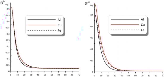 Figure 15 shows time dependencies for the average heater and fin temperatures. Almost identical temperatures are observed for the steady state of the heater, and small differences in the average fin temperatures can be found. The differences in the values of the average heater temperatures for different materials do not exceed 3%, and the maximum detected difference in the average temperatures of heat-conducting blocks made of copper and iron is less than 15%.