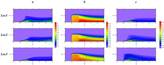 Figure 16 shows the temperature fields for different fin positions and various cross-sections. When the fins are close to the wall (Loc1), the flow velocity in this small interval decreases, and the temperature increases. In the case of increasing the distance of the fins from the wall, the velocity of the fluid increases. As a result, the temperature drops. The opposite effect is observed in the area between two fins, namely, with a decrease in l1/H, l2/H increases. The results are more interesting directly in the sections along the fins, where, with the maximum convergence of the fins, the temperature within the fins begins to increase due to a decrease in the flow rate between them. As a result, the heat transfer from the inner surfaces of the ribs worsens, and the temperature in them begins to rise. What can have a negative effect in the future? It is the overheating of the energy source. In this case, the best indicators are the average location of the edges. In support of this analysis, Figure 17 and Figure 18 show an increase in temperature when the two heaters come close together. Figure 18 shows that the zones of maximum temperatures at Loc1 and Loc2 are placed behind the heat-conducting blocks, which is due to the drift of the heated medium by the flow. In the case of Loc3, the maximum temperatures are observed in the zone under the ribs, which should cool.